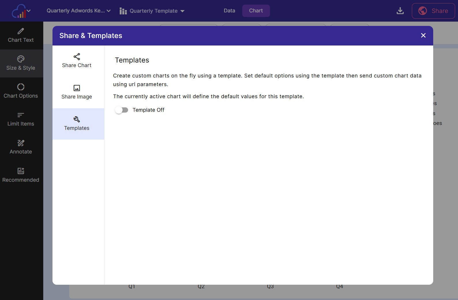 From the main toolbar, open the Share & Template Dialog. Click Template from the left sidebar, and toggle the template to on. This just turned your current chart into a template to use for chart generation.